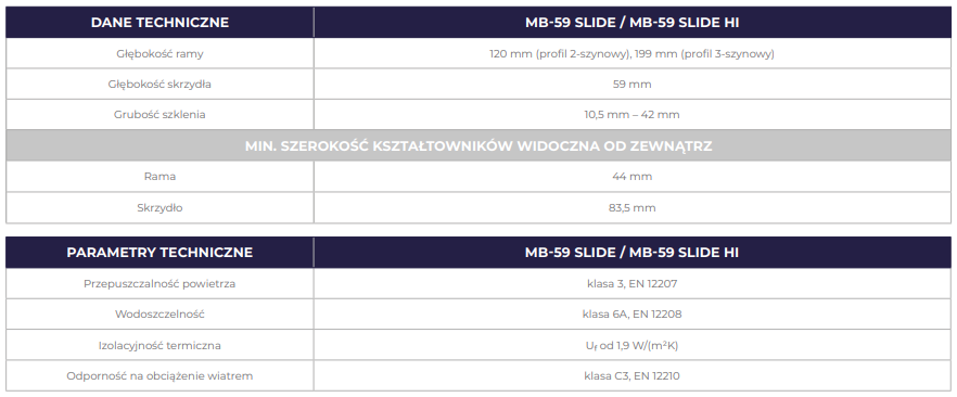 - Kształtowniki systemu MB-59 Slide posiadają dwa różniące się izolacją termiczną warianty konstrukcji: ST i HI. Oprócz różnych wariantów izolacji termicznej, system MB-59 Slide oferuje również różne możliwości konstrukcyjne ościeżnic. Dostępne są ościeżnice dwu- oraz trzyszynowe, co pozwala na dopasowanie systemu do indywidualnych potrzeb i wymagań użytkownika.