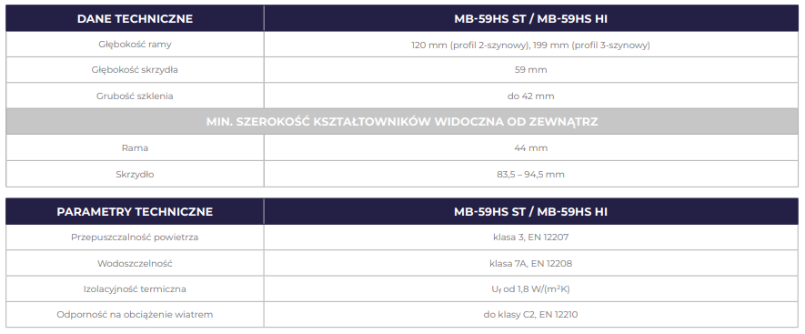 - Warianty konstrukcji systemu MB-59HS posiadają różną izolację termiczną, a dostępne profile obejmują ościeżnice dwu- oraz trzyszynowe oraz skrzydła do dwóch wysokości wózków jezdnych. Oferowany szeroki zakres szklenia umożliwia montaż zestawów jedno- lub dwukomorowych, w tym akustycznych lub antywłamaniowych.