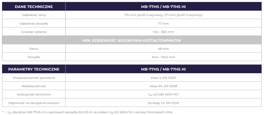 - Zastosowane materiały i rozwiązania techniczne pomagają osiągnąć wysoki stopień ochrony cieplnej i akustycznej. Budowa profili pozwala na wykonywanie ekskluzywnych drzwi o dużych gabarytach, wypełnionych szkłem jedno- lub dwukomorowym. Posiada dwa różniące się izolacją termiczną warianty konstrukcji: ST i HI. System MB-77HS należy do produktów o najlepszych parametrach i spełnia wszelkie wymagania stawiane tej grupie produktów.